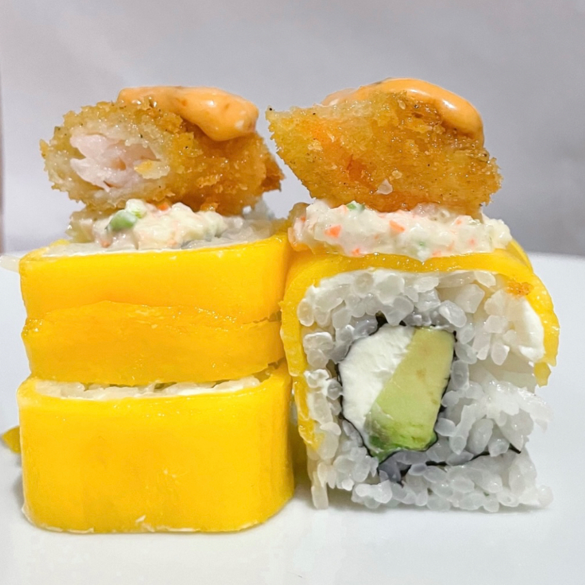 pd: aguacate, surimi y pepino. Pf: queso crema, mango y nuez caramelizada (fuera de temporada se trabaja con platano frito)