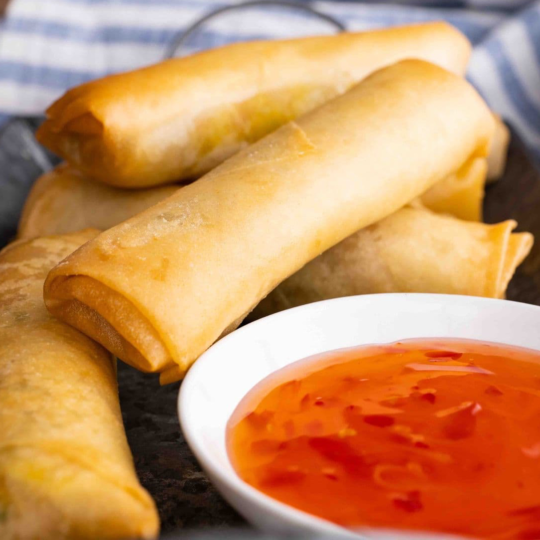 3 piezas de Spring roll rellenos de vegetales y acompañados de sweet chili sauce