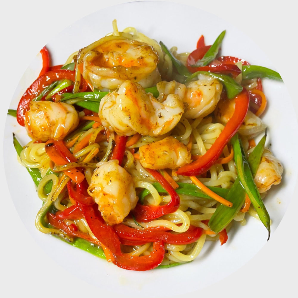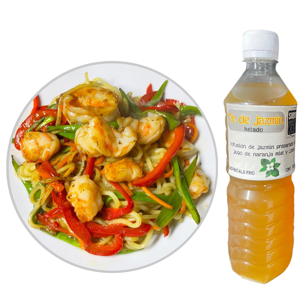 fideos salteados acompañados de verduras morron rojo, zanahoria y cebollin con nuestra rica salsa de la casa dulce y picante al vez y proteina a elegir. 350gr