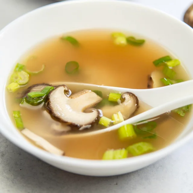tradicional miso japonesa con cebollin, hongo shitake y fideos harusame