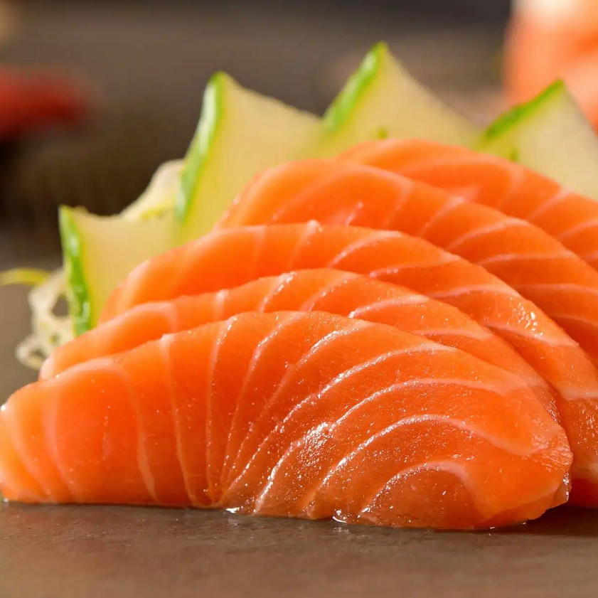 corte grueso de salmon importado sobre cama de pepino y zanahoria, cebollin y un toque de masago, acompañado de ponzu (150gr de proteina)