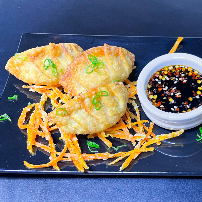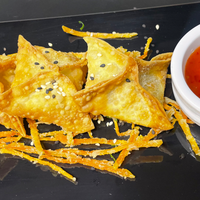 5 pz de won ton crujientes rellenos de pollo y verduras, acompañados de chili sauce