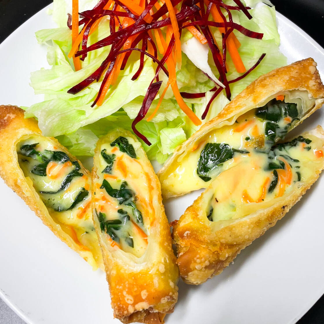 2 rollos harumakis cortados por mitad, rellenos de queso manchego y verduras, acompañados de ensalada