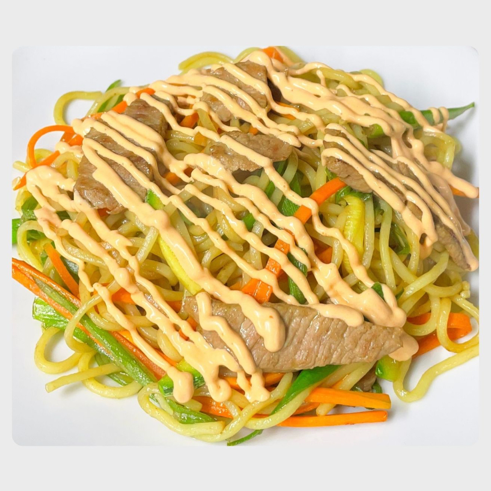 fideos salteados acompañados de verduras calabaza, zanahoria y cebollin con salsa chipotle mayo y proteina a elegir