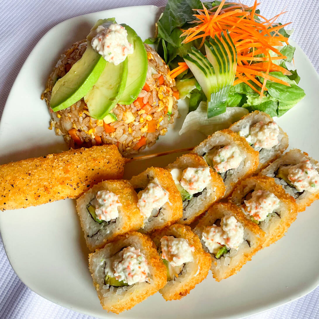 Manche roll, yakimeshi de verdura, 1 pz harumaki, kushiague de queso