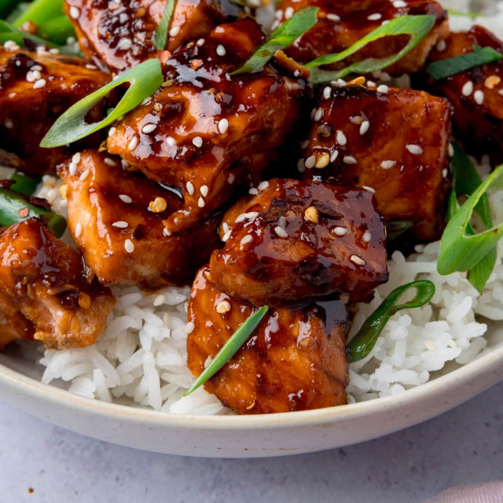 150gr de cubos de salmon a la plancha bañados en salsa teriyaki de la casa sobre un bowl de arroz gohan. terminado con rabo de cebollin y mix de ajonjoli