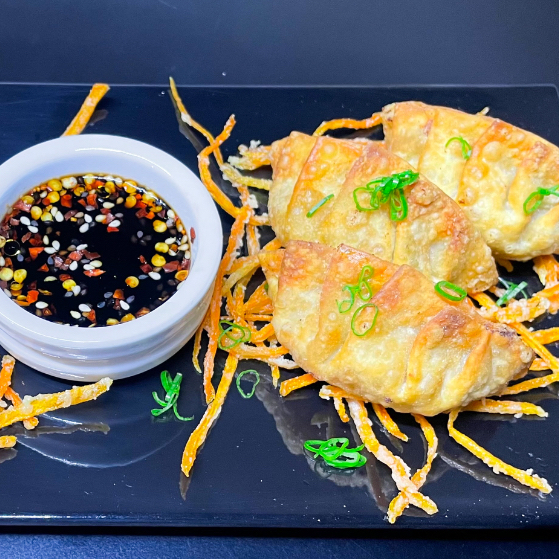 ravioles japoneses fritos rellenos de camaron y especies. acompañadas de vinagreta de chile y soya