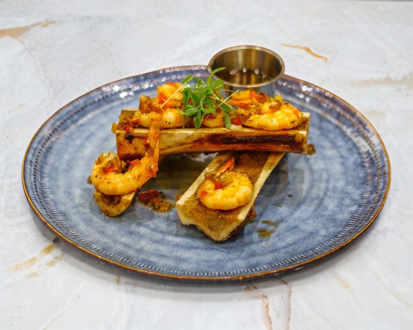 Deliciosos tuétanos y camarones se combinan en perfecta armonía, acompañados de una compota de mantequilla. Todo servido con tortillas de maíz y un toque de chimichurri.