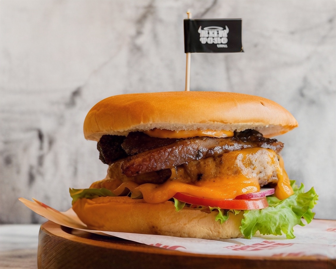 Carne 100 % black angus a la parrilla de tiras de pork belly, queso cheddar, jitomate, cebolla morada, lechuga, aderezo de sriracha y pan brioche. Acompañada de papas a la francesa.