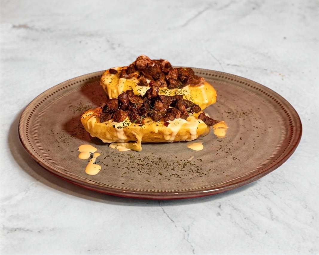 Rellena a base de espinacas salteadas con tocino, mantequilla y elote. Gratinadas con queso manchego, acompañada con chimichurri.
