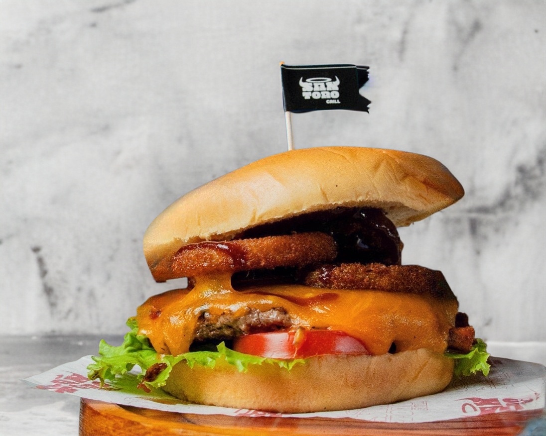 Carne 100 % black angus a la parrilla, pan brioche, jitomate, queso cheddar, lechuga, aros de cebolla empanizados, bañados en salsa BBQ de la casa. Acompañada de papas a la francesa.
