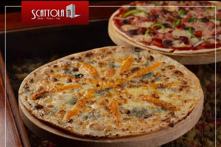 Salsa Pomodoro, queso, camarón y champiñón al mojo de ajo, cilantro fresco y pesto de albahaca.