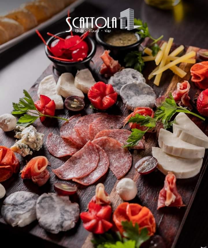 Láminas de filete de res, vinagreta de olivo, cítricos, salsas negras, pesto de albahaca y parmesano.