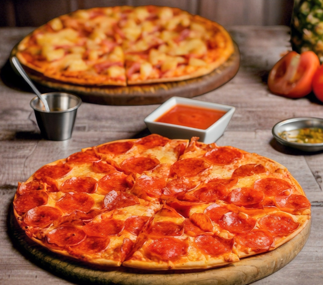 Salsa de tomate, queso, pepperoni, jamón champiñón.