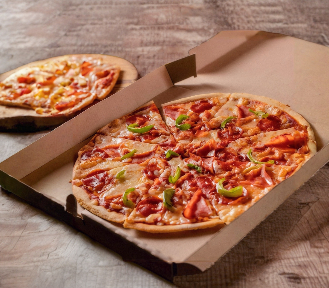 Salsa de tomate, queso, jamón, pepperoni, tocino y pimiento.