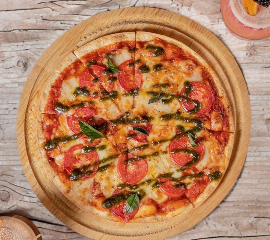Salsa de tomate, queso,tomate rebanado y pesto de albahaca.