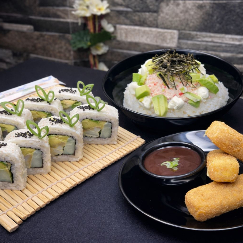 Arroz al vapor con aguacate, queso crema y tampico acompañado de salsa dulce