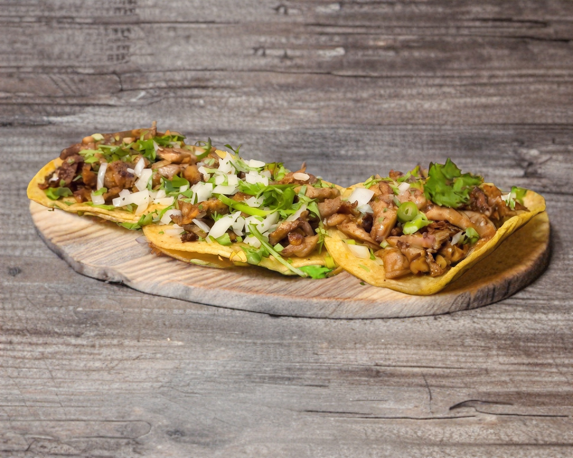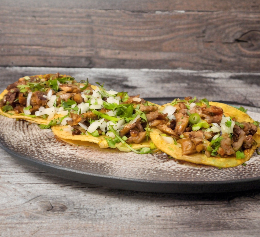 3 Tacos de tortilla de maíz, proteína a elegir, cilantro, cebolla, incluye rábano o pepino, limón, cebollines y salsas.