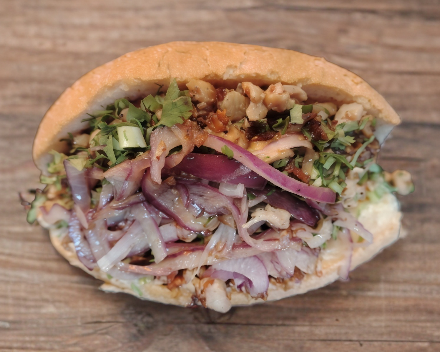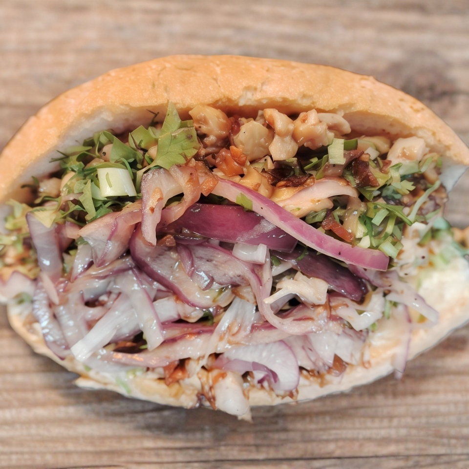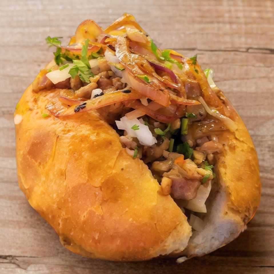 Pan, mayonesa, proteína a elegir, cebolla morada, cilantro, incluye rábano o pepino, limón, cebollines y salsas.