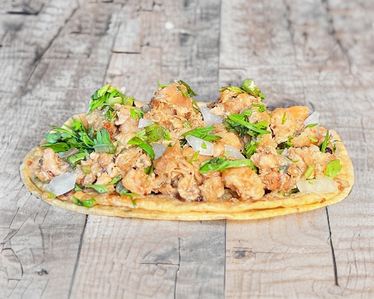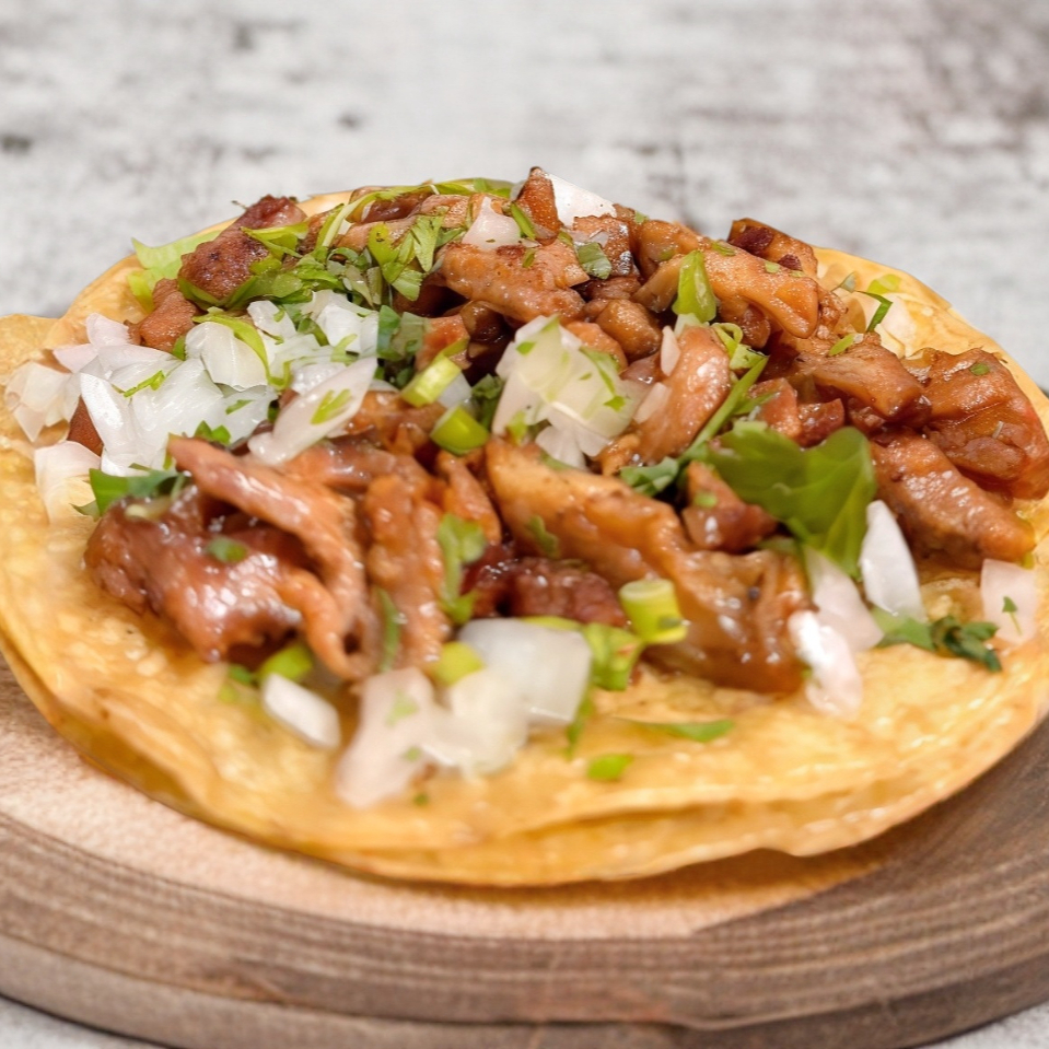 1 Taco de tortilla de maíz, proteína a elegir, cilantro, cebolla, incluye rábano o pepino, limón, cebollines y salsas.