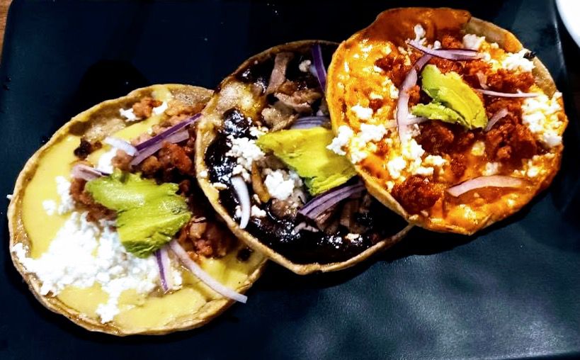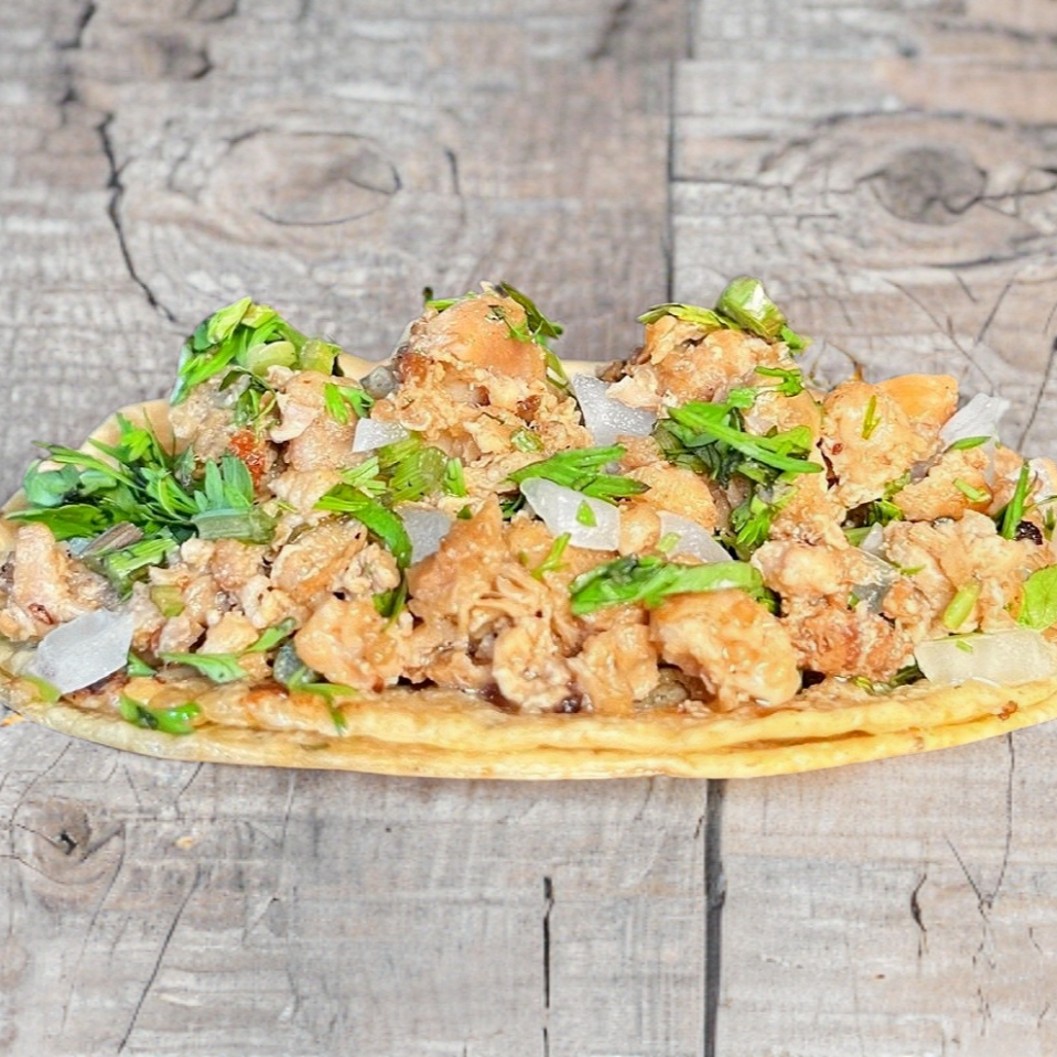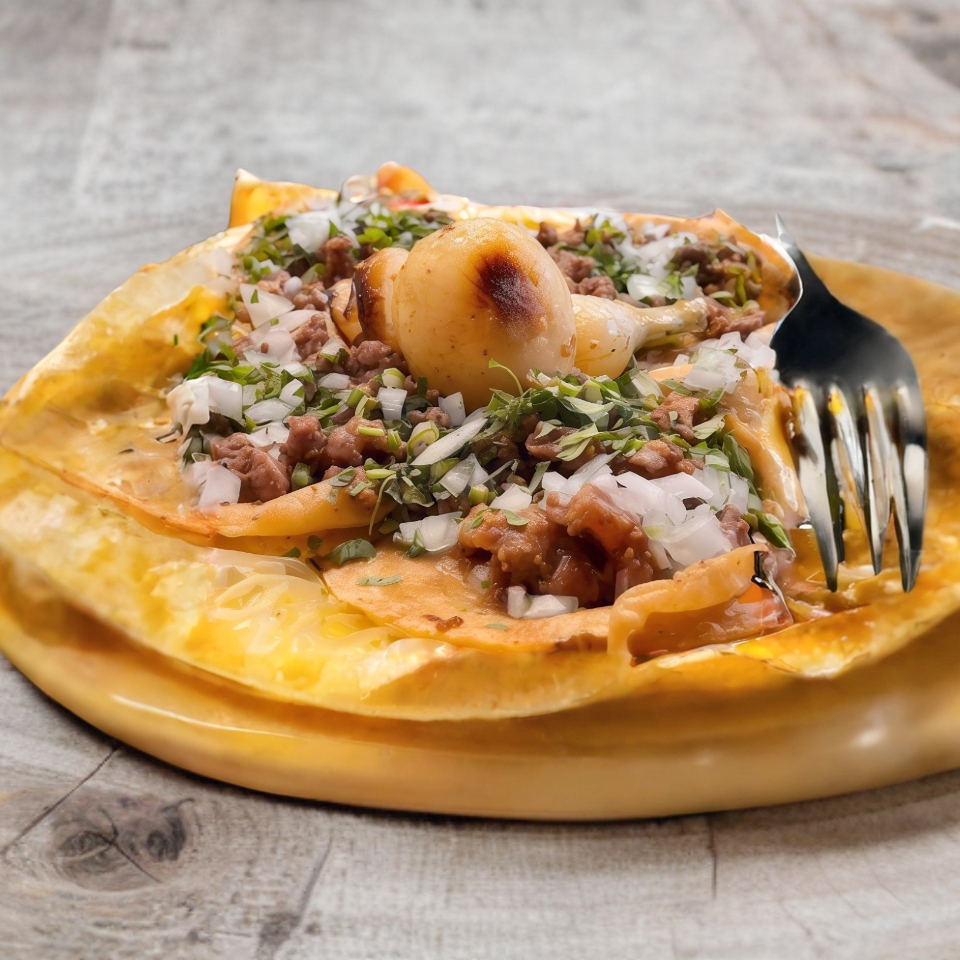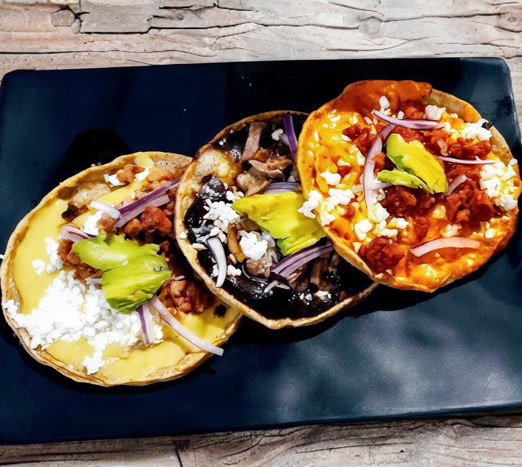 Sope de maíz con salsa y proteína a elegir, queso, cebolla morada y aguacate.