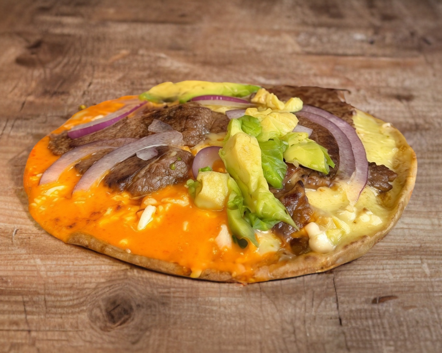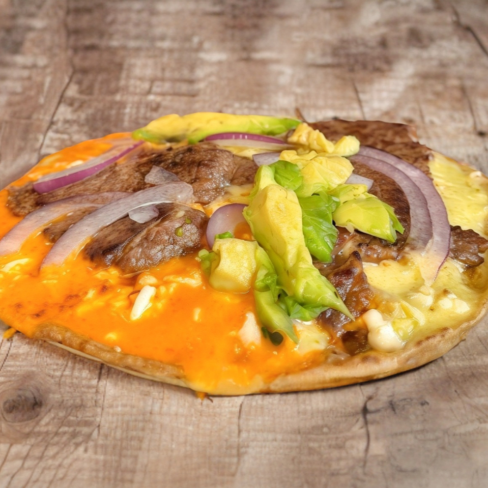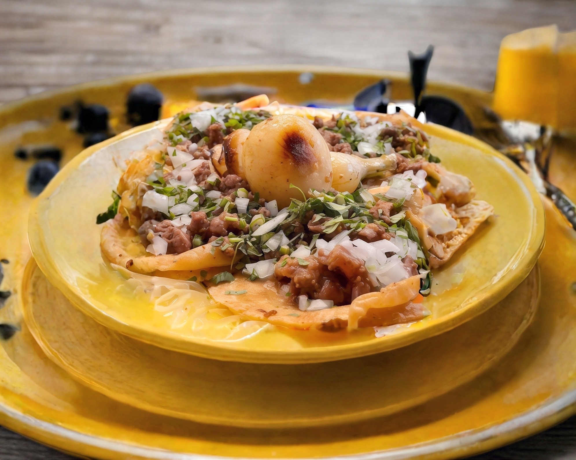 Sope de maíz con salsa y proteína a elegir, queso, cebolla morada y aguacate.