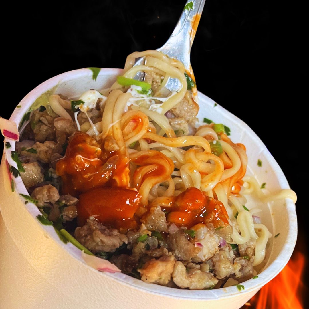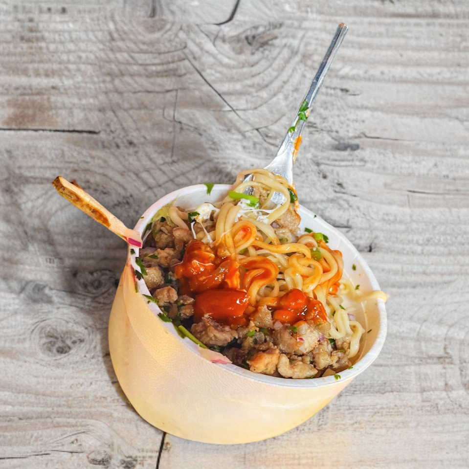 Sopa instantánea, proteína a elegir, mayonesa, queso Oaxaca, cilantro y cebolla, incluye salsa Valentina, búfalo y limones.