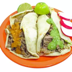 Tortilla de maíz, carne a elegir (pastor, árabe o bistec) y queso gratinado. 3 Piezas.