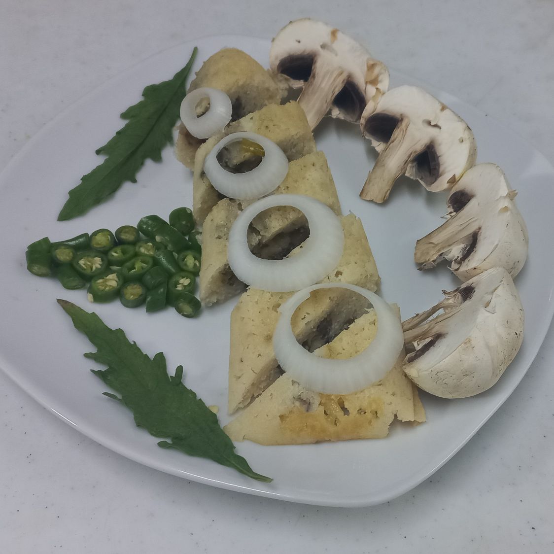 Tamal acompañado de champiñón, cebolla, chile verde, epazote, y queso manchego