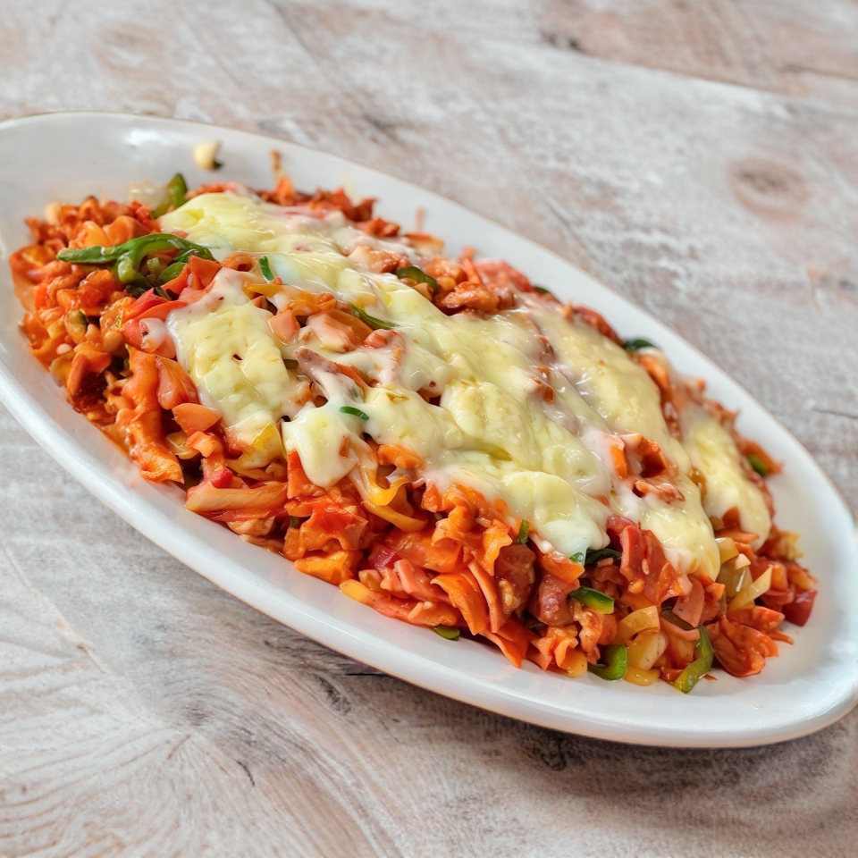 Hecho con carne al pastor, chuleta, tocino, chorizo, jitomate, chile poblano, cebolla y queso manchego gratinado. Se acompaña con salsa verde, salsa roja, 20 tortillas y limones.