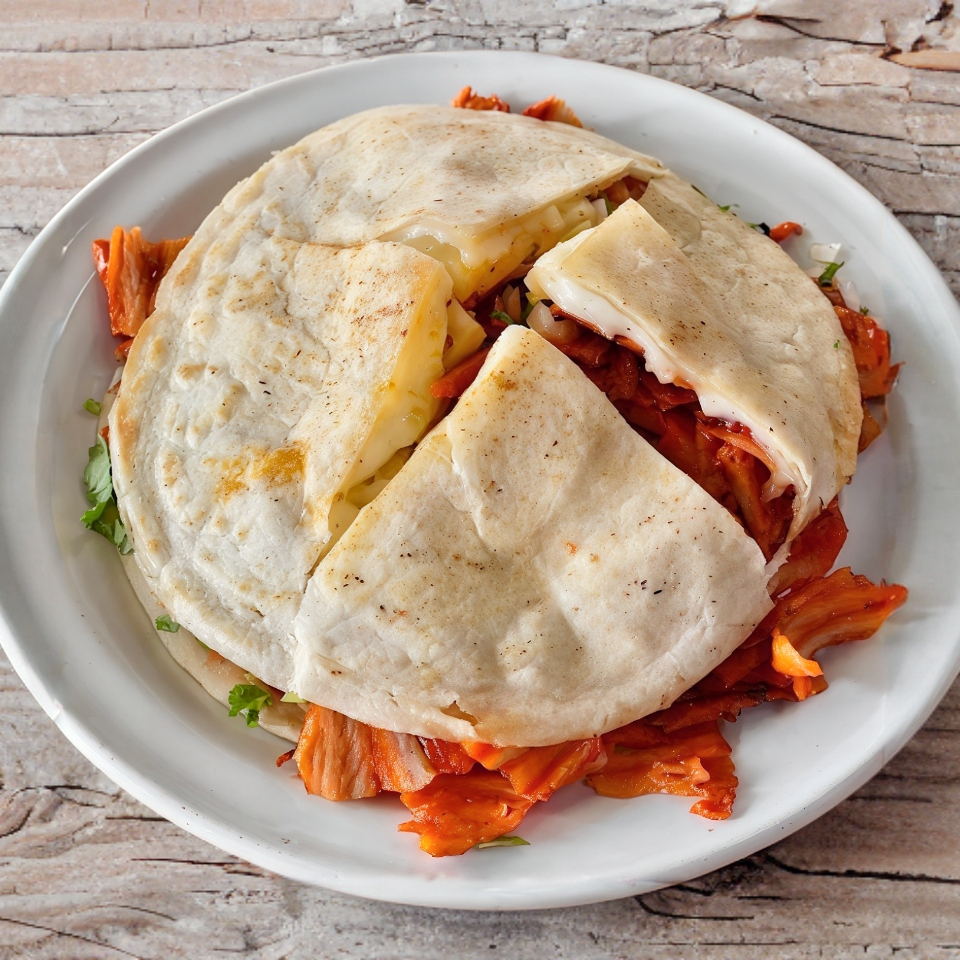 Tortilla de harina, queso manchego, cebolla, cilantro y carne al pastor.