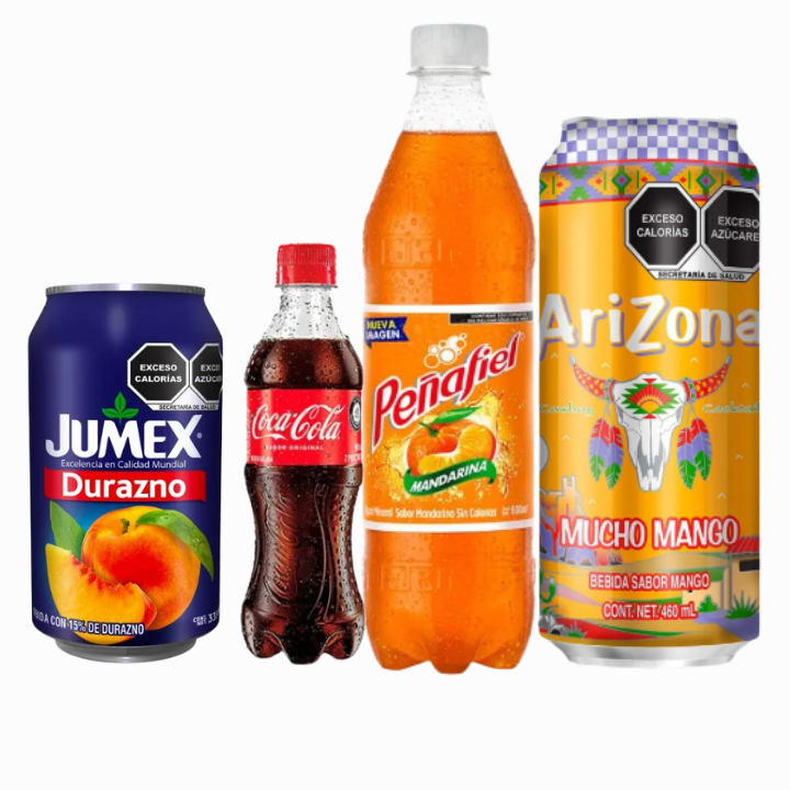 Elige tu refresco: Jumex lata 355 mL (sabor aleatorio), Coca-Cola 400 mL o Peñafiel 600 mL (sabor aleatorio). Arizona (Sabor aleatorio)