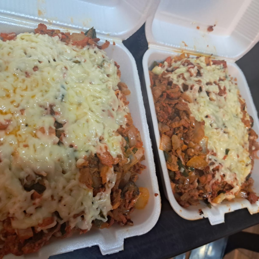 Cebolla,poblano, jitomate,longaniza,jamón,tocino,chuleta,carne árabe,carne al pastor queso fundido