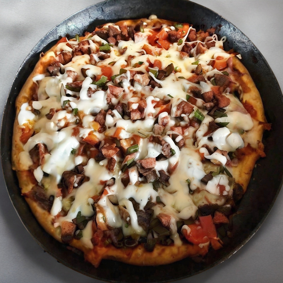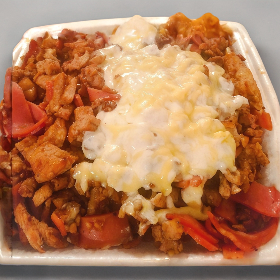 Chuleta, jamón, tocino, cebolla, chile poblano y queso.