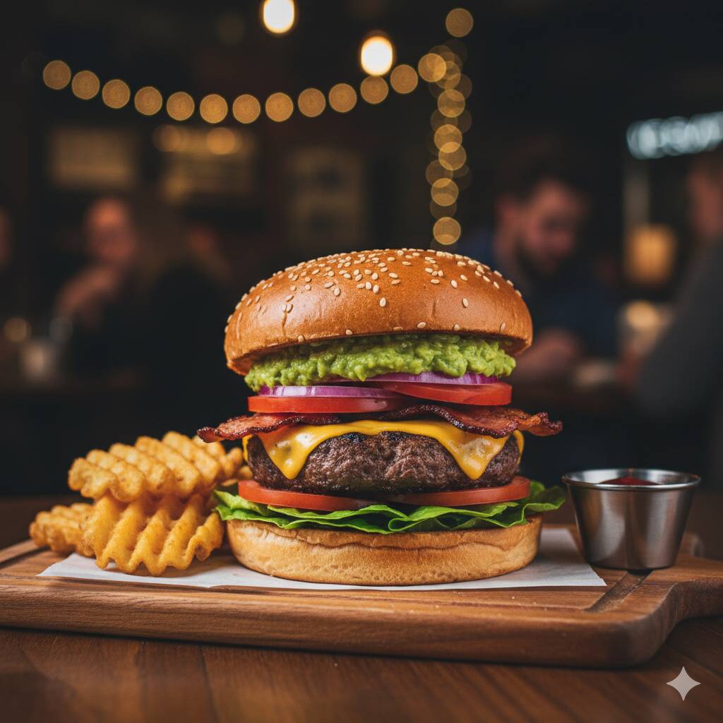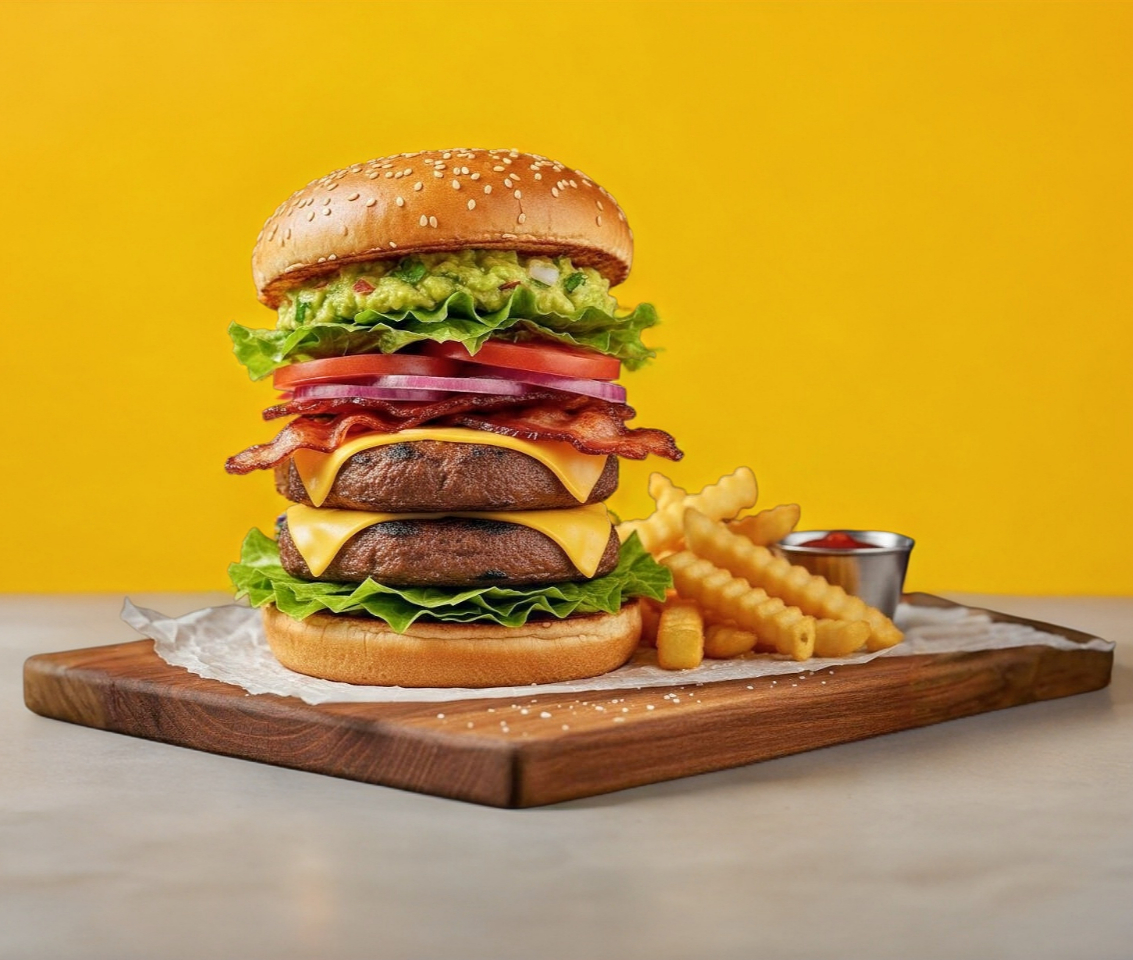 Burger con guacamole picante, doble carne, doble queso, tocino, lechuga, jitomate, cebolla acompañada de 150gr de papas fritas.