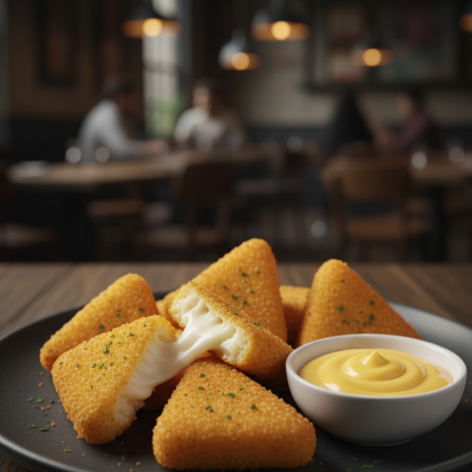 8 triángulos de queso Chihuahua, cubierto con empanizado y trocitos de chile de árbol, acompañados de queso líquido.