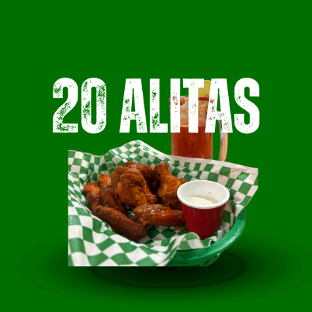 Doble de Alitas – 10 piezas pagas, 20 piezas disfrutas. No incluye ranch.