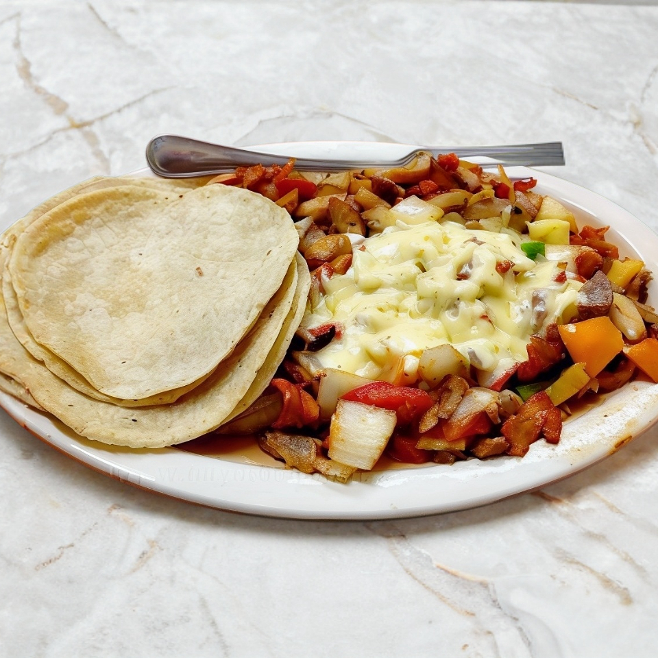 ShopSuey (350 gr) Incluye: cebolla, poblano, chorizo, bistec de puerco, jamón, tocino y queso fundido con 10 tortillas de maíz botanera