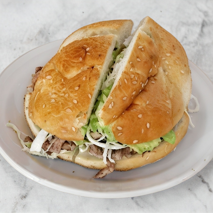 Submarino individual (350 gr) Incluye: pastor, bistec de puerco, jamón, tocino y queso fundido con 10 tortillas de maíz botanera