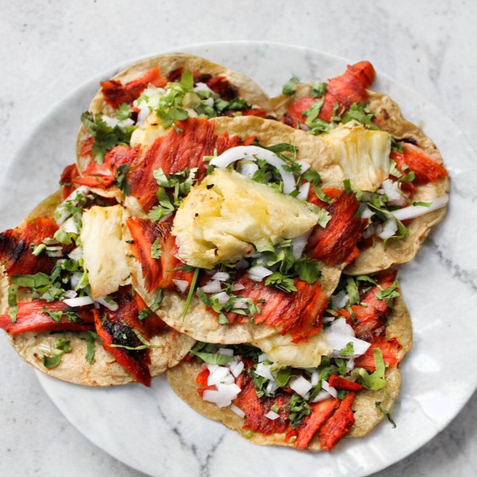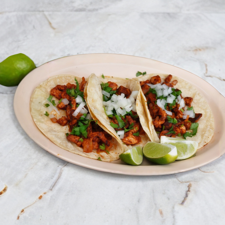 Tacos al pastor con tortilla de harina 3 piezas. incluye: cebolla, cilantro y piña