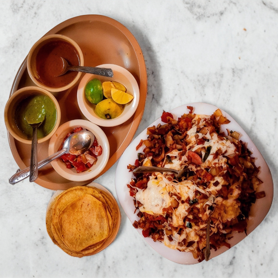 Doble mexicano (350 gr) Incluye: salsa mexicana, bistec de puerco, jamón, tocino y queso fundido con 10 tortillas de maíz botanera