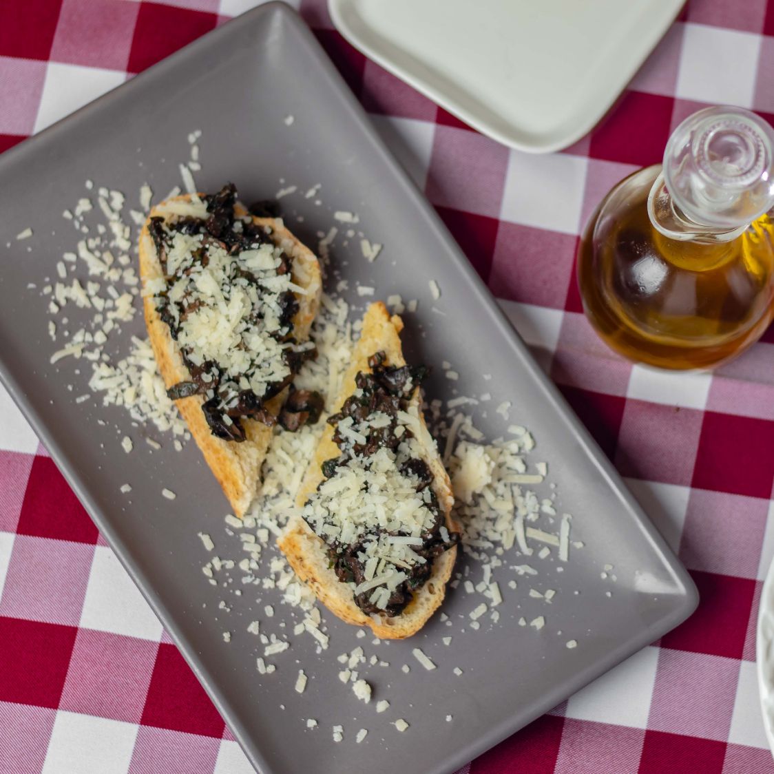 Champiñones fileteados en vinagreta de vino tinto y aceite de oliva con queso parmesano.