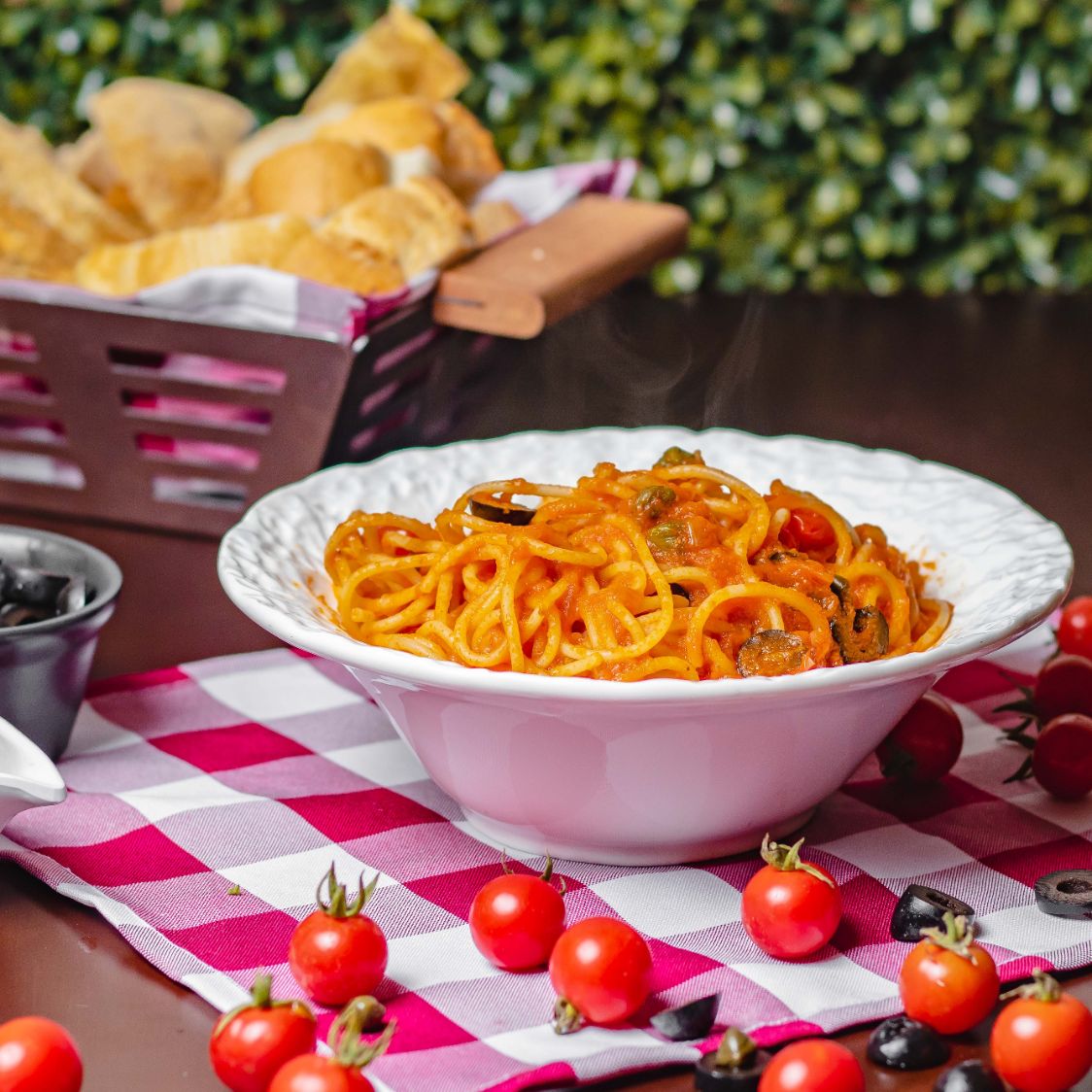 Salsa de pomodoro con ajo, aceituna negra, alcaparra y jitomate cherry con queso parmesano.