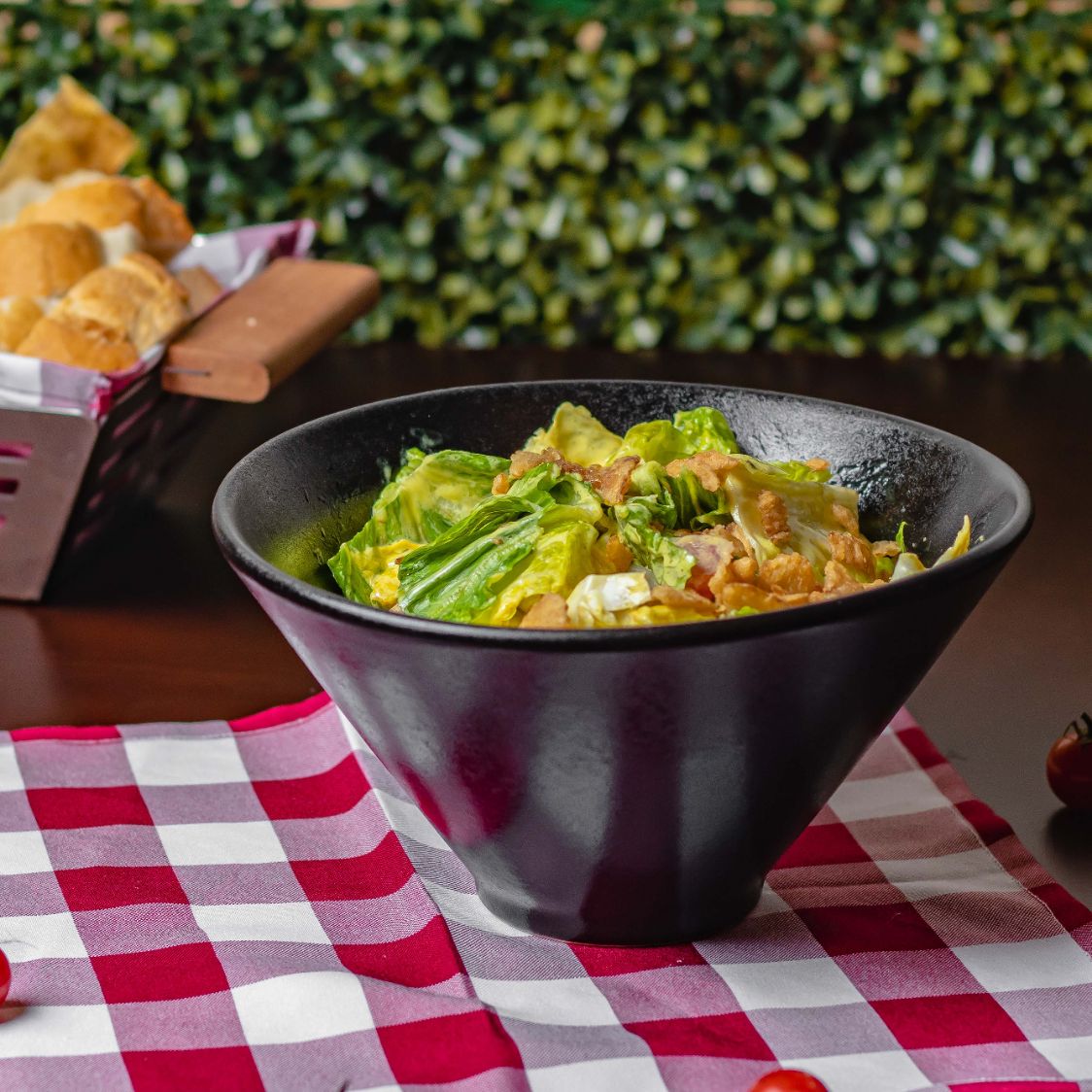 Mix de lechugas y arúgula con queso de cabra, nuez y jamón serrano, aderezado con vinagreta de aceite de oliva y vinagre balsámico.