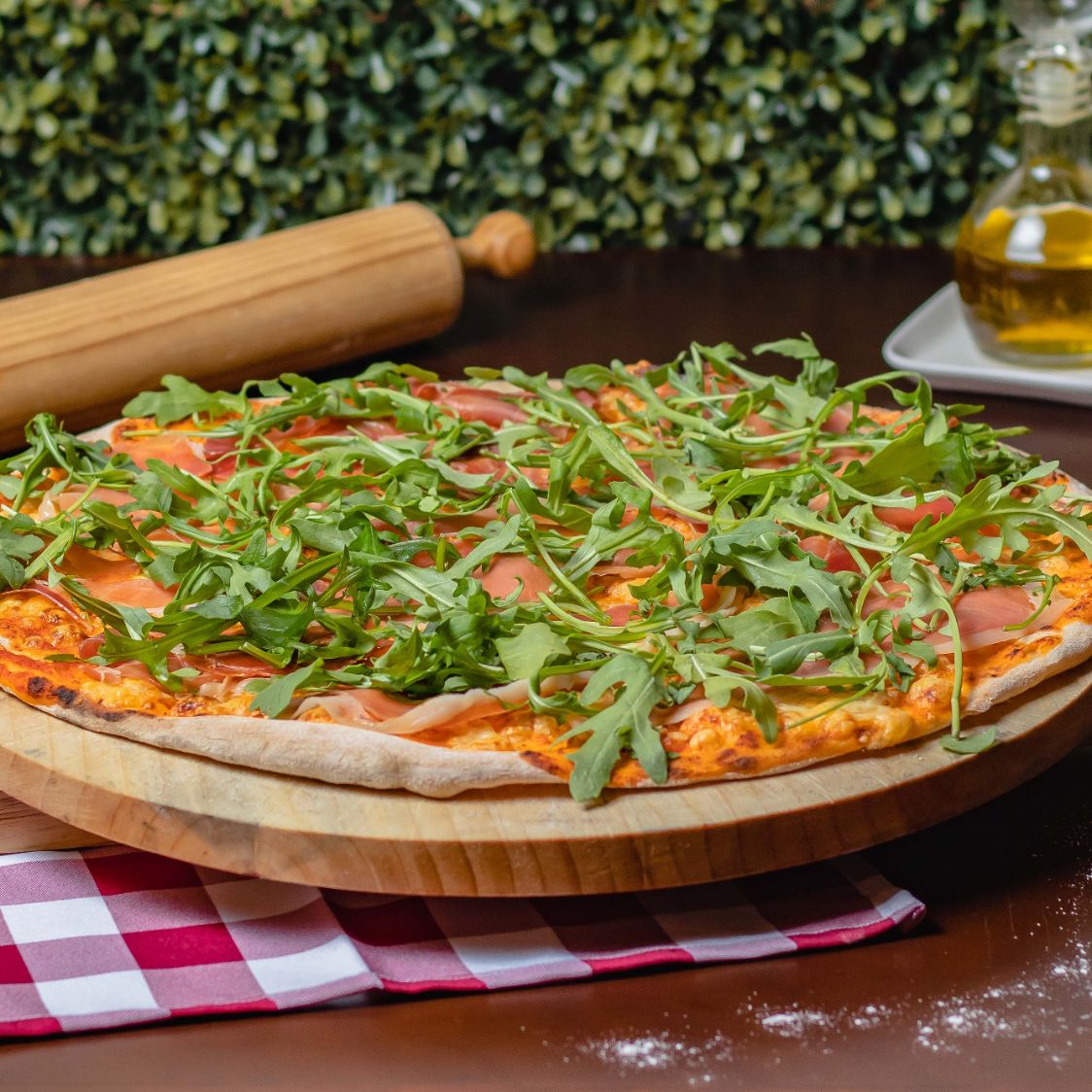 Pan de masa de pizza, jitomate, jamón serrano, aderezo de la casa y arúgula.