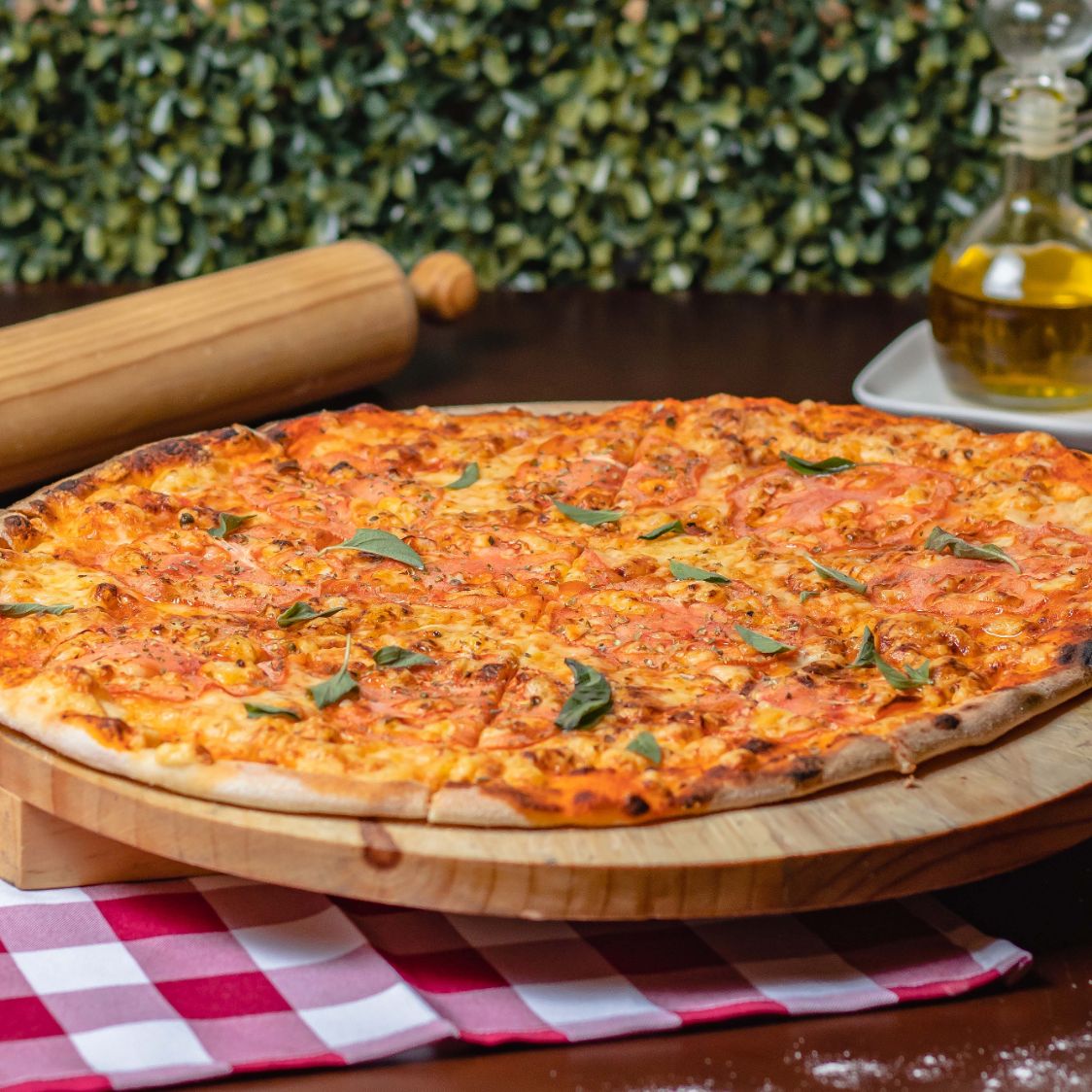 Pan de masa de pizza, rodajas de jitomate y queso mozzarella, bañada en aderezo de albahaca.