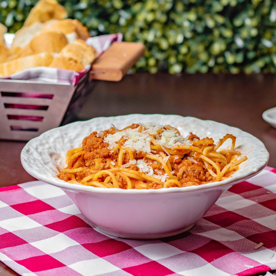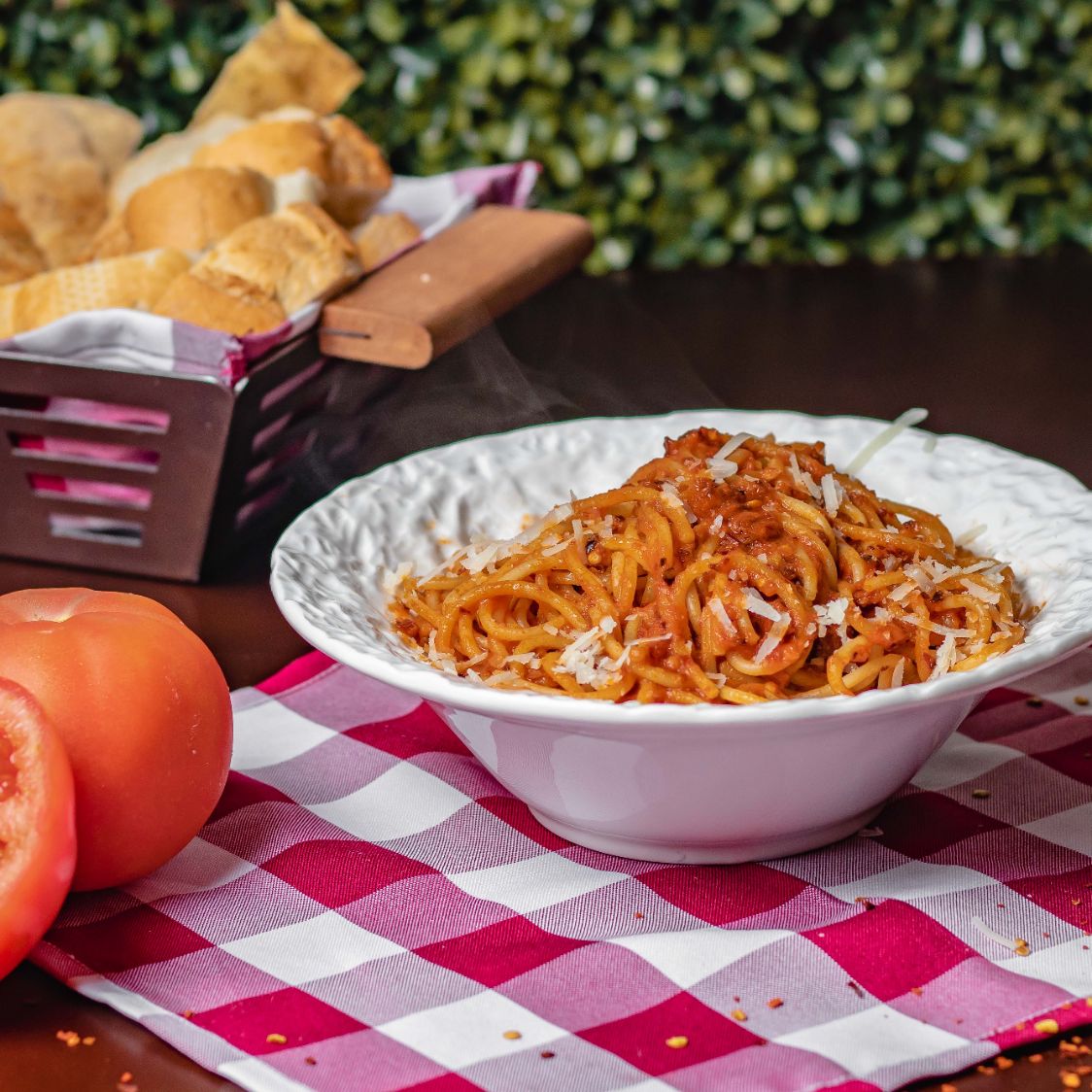Salsa de pomodoro y ragú de carne con queso parmesano.
