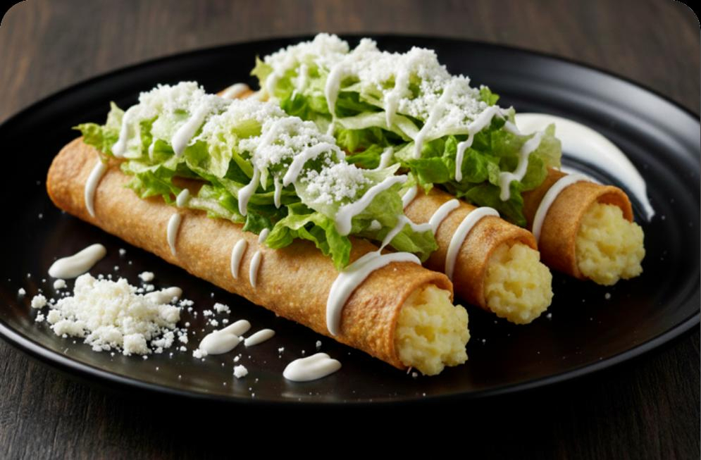 Crujientes y doradas, las flautas de papa son un platillo delicioso que combina la suavidad de las papas con una textura crujiente. Son ideales para disfrutar solas o acompañadas de salsas y guarniciones, ofreciendo un sabor reconfortante en cada bocado. Perfectas para compartir en reuniones o como un antojo en cualquier momento.