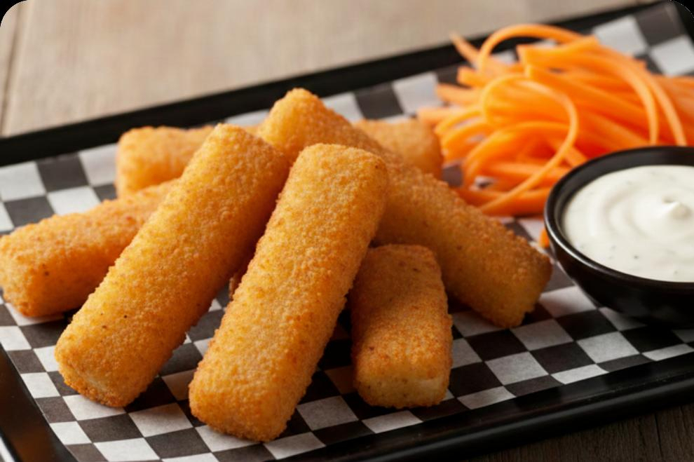 Crujientes y sabrosos, los dedos de queso son perfectos para acompañar con aderezo ranch y vegetales frescos. Cada porción incluye seis piezas, ideales para compartir o disfrutar como un aperitivo. Su textura dorada y su sabor a queso los convierten en una opción deliciosa para cualquier ocasión.