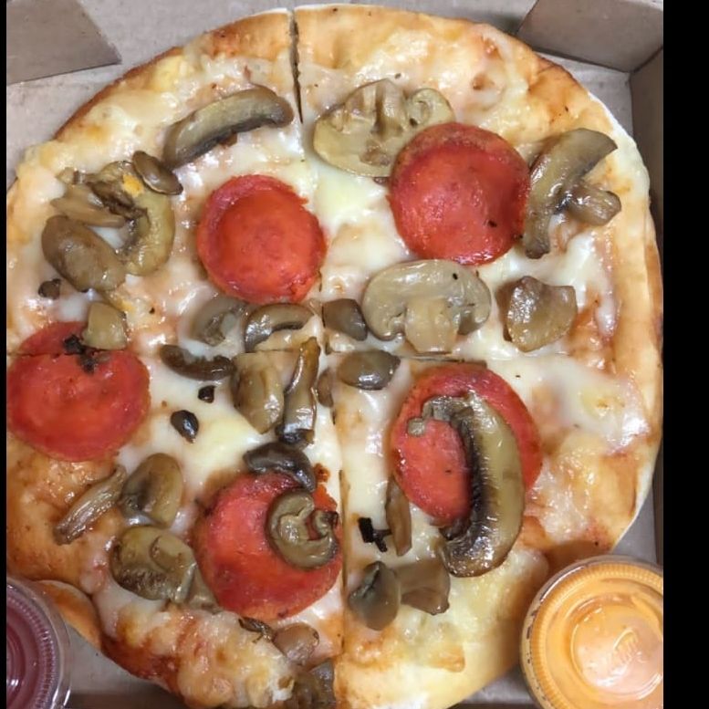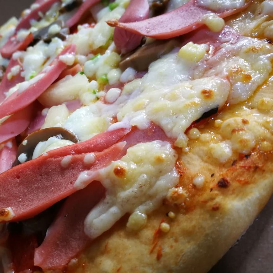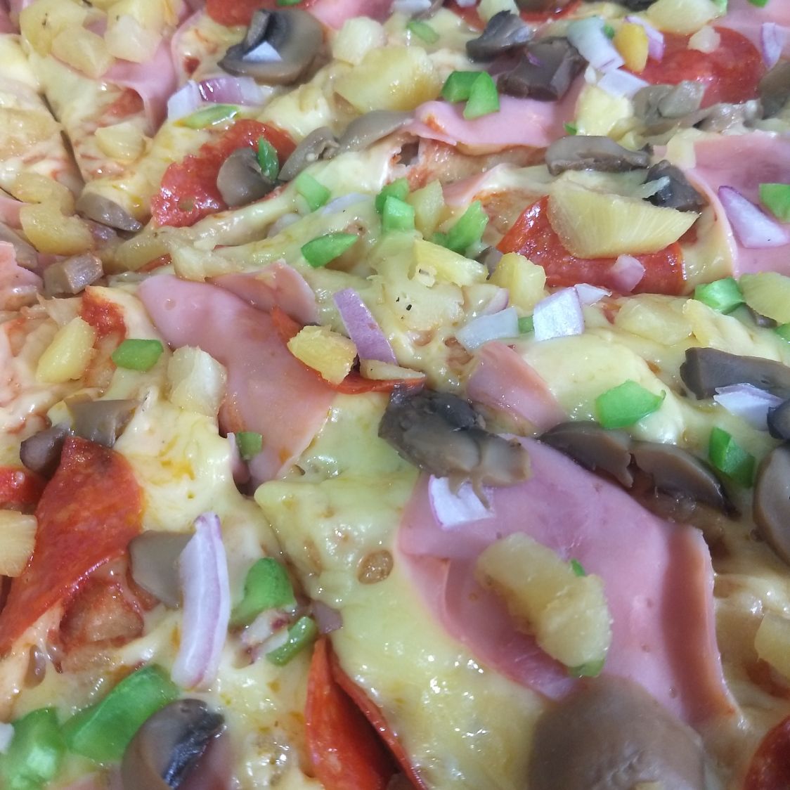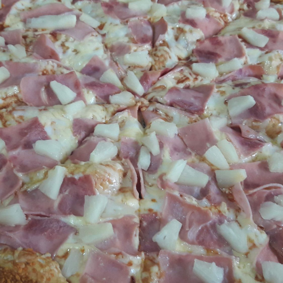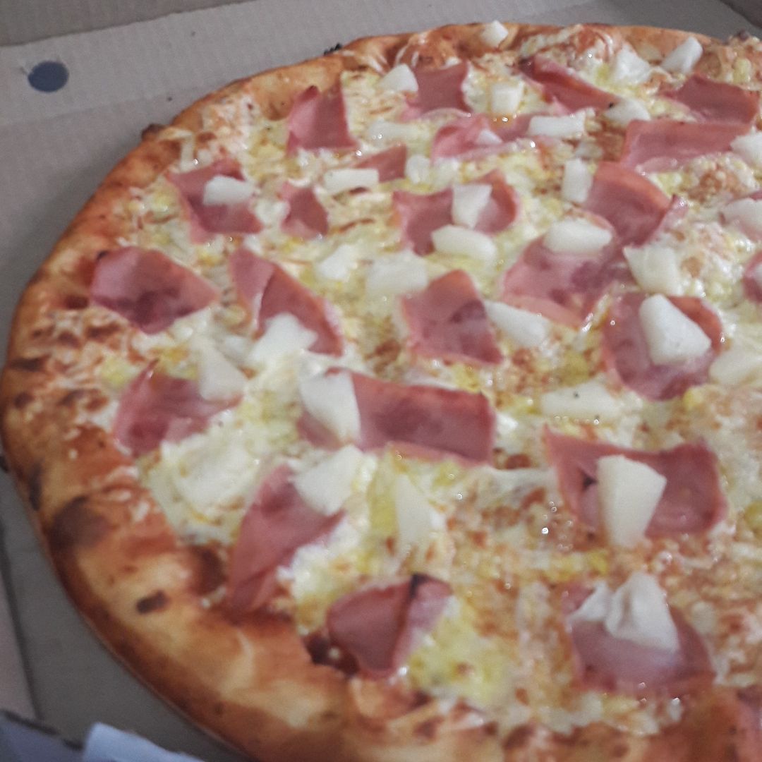 Jamón, queso, piña y champiñón, incluye papas a la francesa.